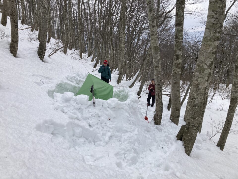 春山の陽気で非常に暑く、アンダー1枚で十分。3時間程度登りシャクナゲ平にかかる急登直前の平らな場所まで進む。この辺りまでくると雪が1m程度。これ以上進んでも積雪量も増えなさそうなので、ここで行動を打ち切り、ショベルを持って土木工事に着手する。東側の斜面に回り込んで工事開始。横穴を掘っていくが、すぐに土が出てきてしまう。雪洞を作るのは難しそうなので、平らに整地しイグルーチックな幕営地を作った。4人で工事したので1時間程で完成、ツエルトを張る。3~4人用ということだが、生活するには問題ない広さだった。