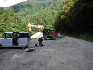 道を進むと通行止めの手前に広場があり、そこに車を停める。