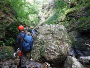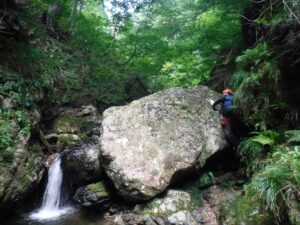 ナメ滝登るのは容易だったが下るのが怪しく懸垂下降し、さらに大きく巻いた場所も懸垂下降する。その後は慎重に下っていく。