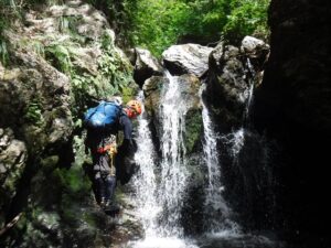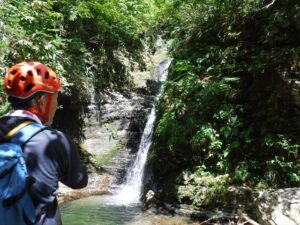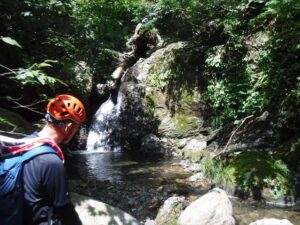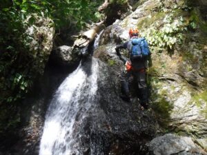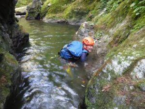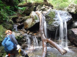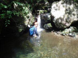 簡単なゴルジュで左をへつりながら進むと、途中で足場が悪くなりドボン。沢登りの洗礼を浴びる。早くもびたびたに濡れてしまったが、続いて進んだ小さな滝でもつるりとドボンする。