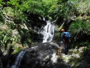 幾つかの小滝を巻いたり、直登したりと進む。左手に200mの壁を見る沢を右に入り、10mくらいの滝を右から巻いて、ナメ滝を登る。