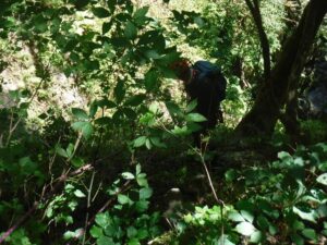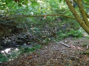 林道とは名ばかりで、廃道となっており、途中土砂崩れで通り辛い。1時間くらいと思っていたが2時間くらいかかり、すぐ左側の沢が出合となる。何か所かピンクの見印や、ペットボトル入れがぶら下がっておりそれが目印にもなる。気がつかないと林道を行き過ぎるかも。こんな時は文明の力が活躍した。一息入れた時にヒル発見。